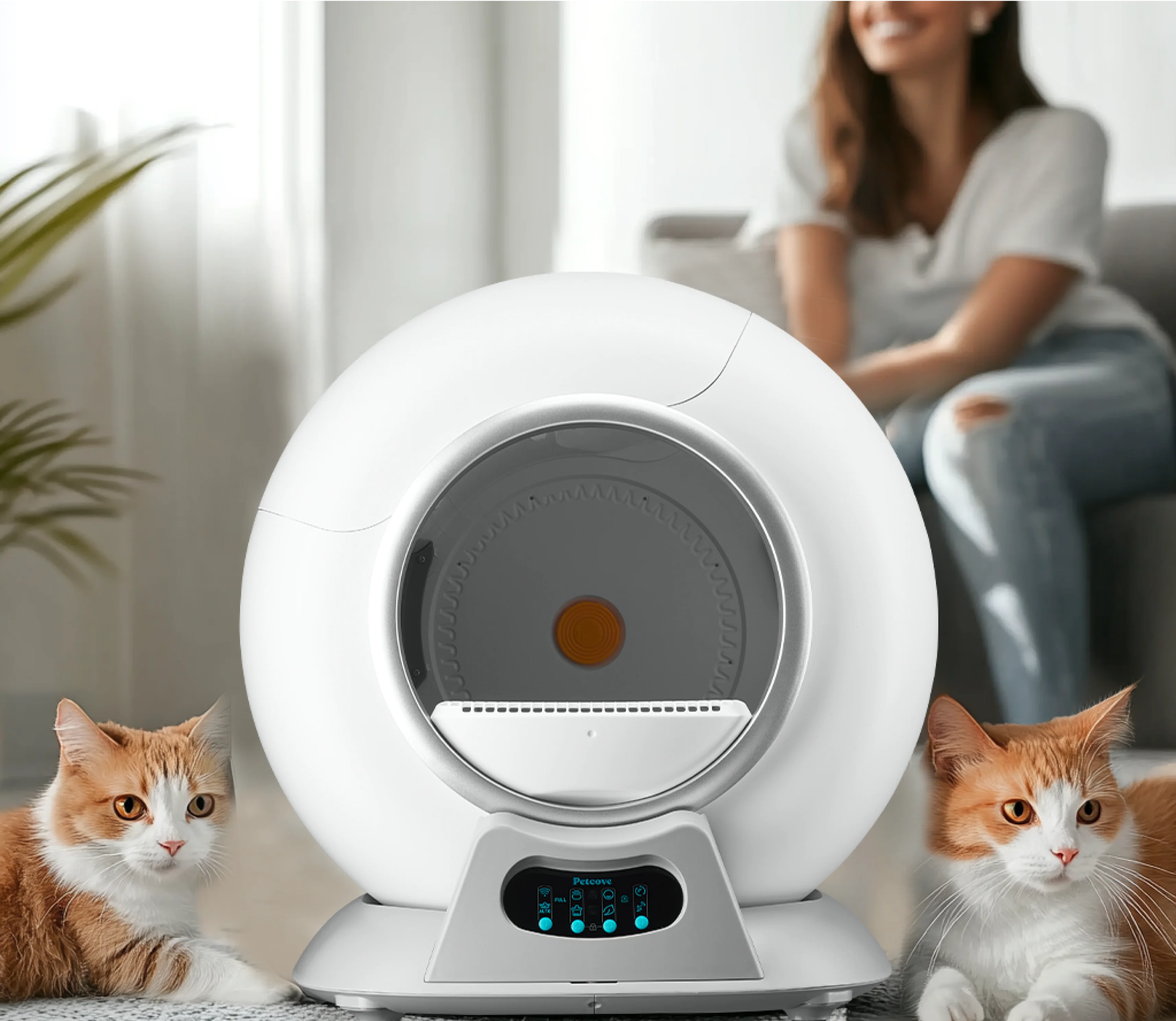 The built-in odor control system uses carbon filters and ion technology to eliminate smells, keeping your home odor-free. Plus, with smart sensors and the Petcove App, you can monitor everything in real-time—from litter levels to your cat’s health habits—all from your phone.